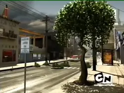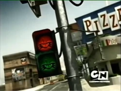 | We're Talking Toon Here (Streetlight) | "We're talking toon here!" Some people say "Sproing, boing, bam, splat!" "All toons all the time. We're the Cartoon Network." The pictured VFX shot happens next. |